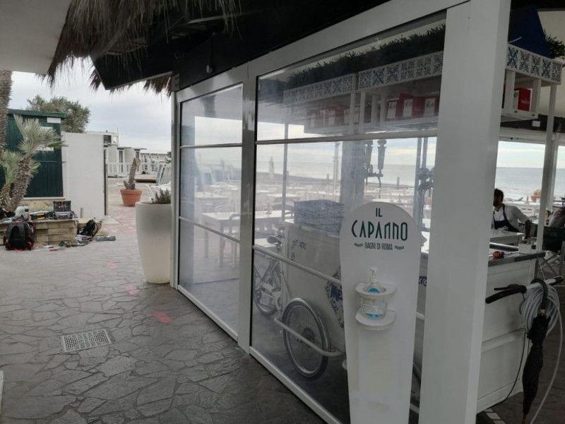 Struttura con chiusure in PVC Cristal trasparente realizzata allo stabilimento Il Capanno a Ostia. Teli che mantengono la vista mare, proteggono dal vento e permettono di aprire lo spazio nei mesi più caldi.